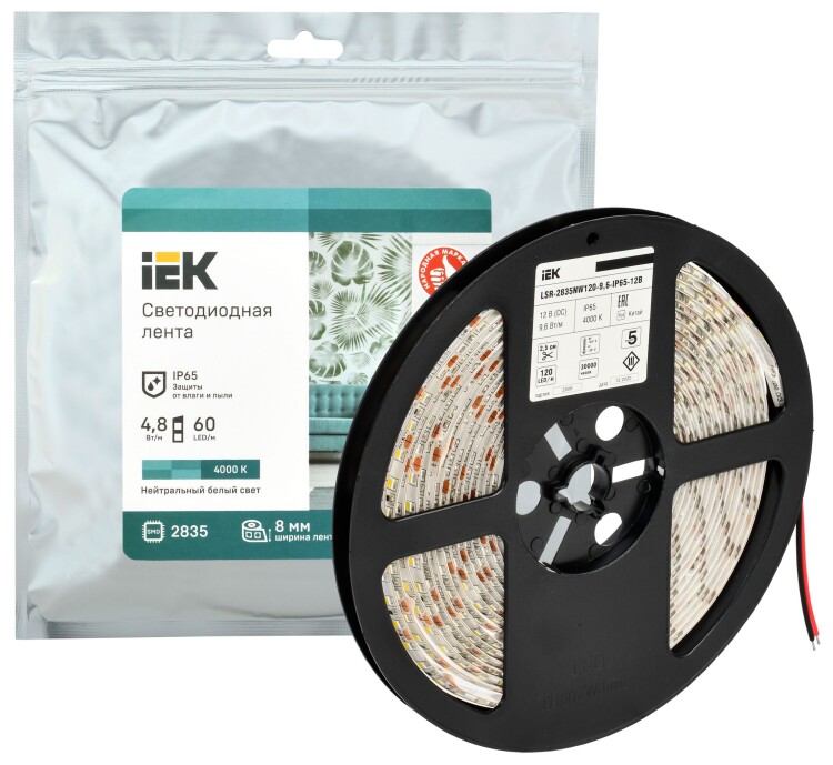 Лента светодиодная IEK LSR-2835NW120-9,6-IP65-12В Standard (12 В, SMD 2835, 9,6 Вт/м, 120 led/м, 4000 К, IP65)