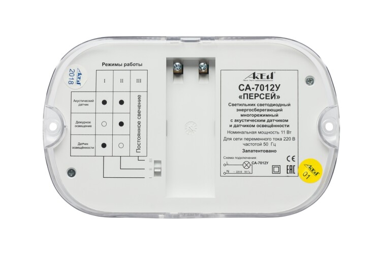 Освещение лестничных клеток, холлов, коридоров, вестибюлей и других помещений с периодическим пребыванием людей в жилых и общественных зданиях. Светильник СА-7012У "Персей" многорежимный с дежурным режимом работы и режимом полного выключения предназначен для работы в сети переменного тока с напряжением 230 вольт.
