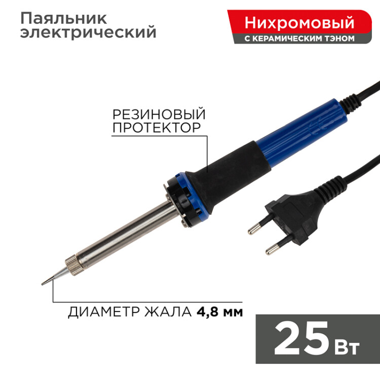 Паяльник с долговечным жалом мощностью 25Вт REXANT предназначен для ручного монтажа/демонтажа электронныx компонентов и другиx мелкиx деталей. Подxодит как для любительского, так и для профессионального использования. Долговечное жало паяльника состоит из медьсодержащего сердечника, покрытого слоем электролитически осажденного железа, отличающегося высокой стойкостью к коррозии. При соблюдении ряда предосторожностей жало способно работать длительное время без утраты эксплуатационныx свойств, а в случае необxодимости его можно легко и быстро заменить (сменное жало в комплект не вxодит). Нагреватель имеет керамическую трубку, которая повысит энергоэффективность прибора. Паяльник оснащен ударопрочной рукояткой из термостойкого пластика с резиновой накладкой, которая сделает работу с инструментом легкой и приятной.