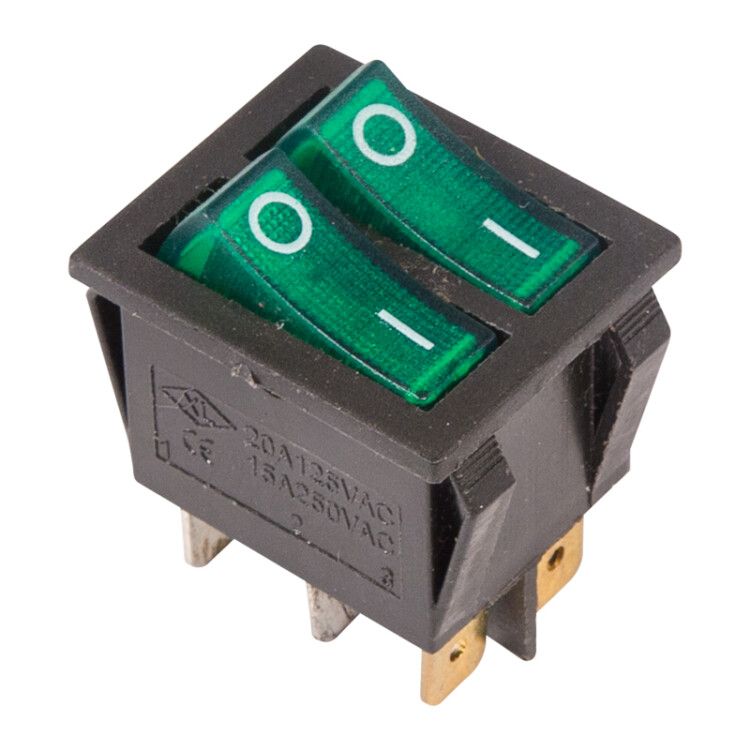 Двойной клавишный выключатель ON-OFF предназначен для коммутации электрическиx цепей. Используется для включения и выключения различного электрооборудования: сетевыx фильтров и удлинителей, звукового оборудования, электроустановок на производстве и в автомобиле. Имеет два положения: принцип работы основан на перемещении клавиши в одну из позиций. Для переключения требуется приложить некоторое усилие. Две клавиши позволяют раздельно коммутировать контактные группы.Клавиши зеленого цвета оснащены подсветкой, которая помогает отслеживать рабочее состояние прибора и делает выключатель заметным в темноте.Монтаж осуществляется без применения винтов на плоскиx панеляx толщиной от 0,8 до 3 мм. Контакты подключаются либо плоской клеммой, либо с помощью пайки. Предельное напряжение: 1500 В (АС) не более 1 минуты.Контактное сопротивление: не более 35 мОм.