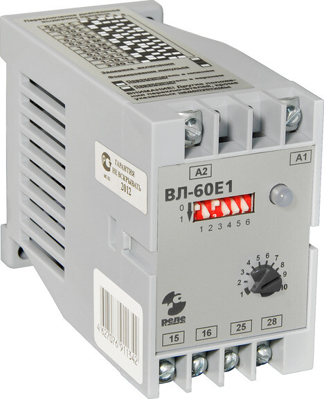 Реле времени ВЛ-60Е1 обеспечивает два режима работы: 'задержка включения' или 'формирование импульса'. Реле имеет широкий диапазон установки времени срабатывания от 0,1с до 30 часов. Выбор диапазона - дискретный, с помощью ДИП-переключателя. Установка выдержки внутри диапазона - плавная, с помощью переменного резистора. Контакты: 1 замыкающий и 1 размыкающий. Питание реле ВЛ-60Е1 универсальное: 24В...220В постоянного или переменного тока.