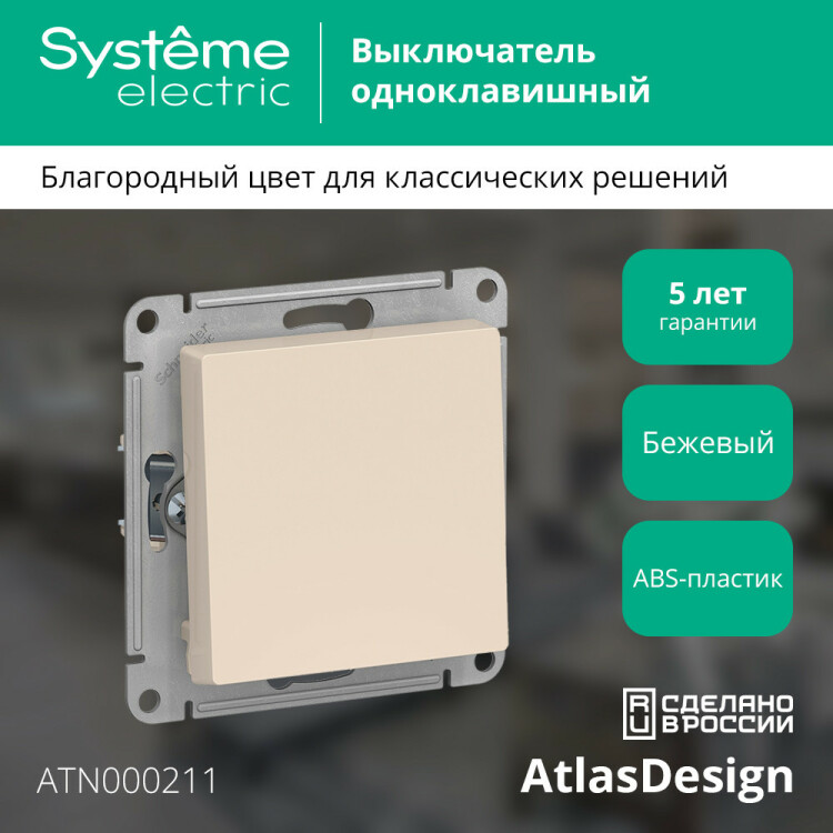 Механизм выключателя 1-клавишного Systeme Electric (ранее Schneider Electric) серии AtlasDesign в цвете бежевый подходит дл я сетей 250 В, на ток 10 А. Усиленные прямые монтажные лапки для лучшей фиксации механизма в монтажной коробке. Лицевые детали из качественного ABS-пластика, устойчивого к царапинам и УФ-излучению. (ранее Schneider Electric ЭУИ UNICA, ЭУИ UNICA NEW MGU5.201.25ZD, NU520144)