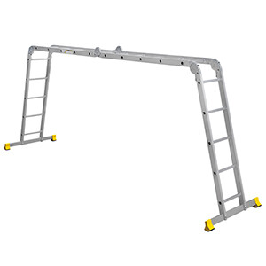 Профессиональная алюминиевая шарнирная лестница-трансформер состоит из 4 секций, соединенных между собой гибкими шарнирами, позволяющими фиксировать изделие в одном из нужных положений - в виде приставной лестницы, стремянки, помоста или Г-образной формы для работы на местности со сложным рельефом.