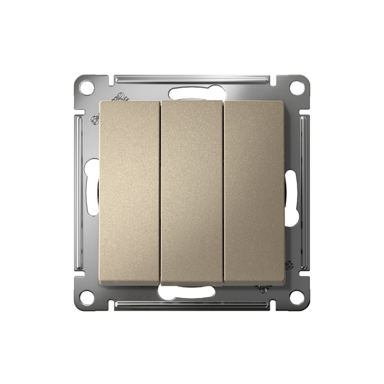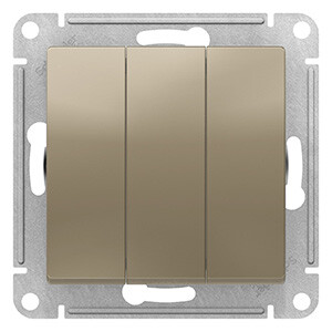 Механизм Systeme Electric (ранее Schneider Electric) серии AtlasDesign в цвете шампань выключателя 3-клавишного подходит дл я сетей 250 В, на ток 10 А. Трёхклавишный выключатель позволяет управлять тремя источниками света из одной точки. Лицевые детали из качественного ABS-пластика, устойчивого к царапинам и УФ-излучению. Усиленные прямые монтажные лапки для лучшей фиксации механизма в монтажной коробке.