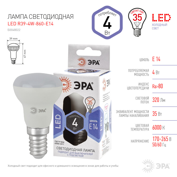 Лампа R39 свд Е14 4Вт 6500К 320лм рефлектор матовая ЭРА