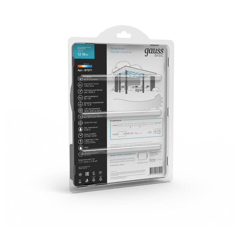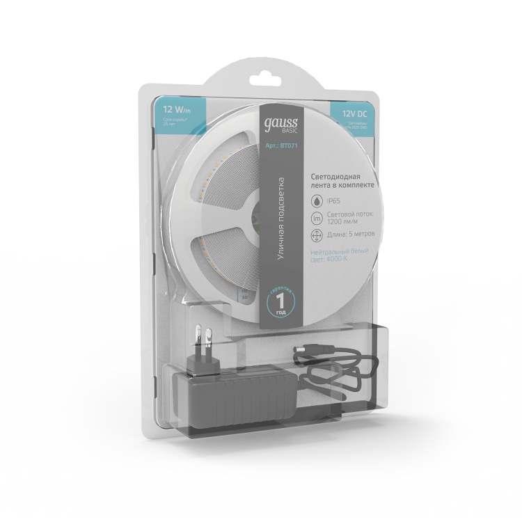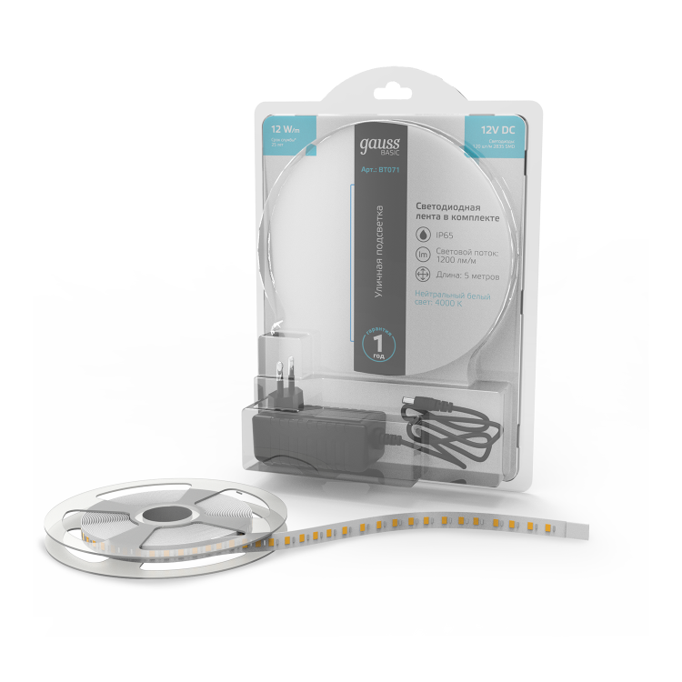 Лента свд 12В 12Вт/м 120свд/м 4000К 1200лм/м 2835 IP65 Gauss 5м комплект