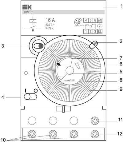 1 - корпус таймера. 3 - индикатор переключения контактов таймера. 5 - ручка установки (коррекции) текущего времени. 7 - внутренний лимб. 9 - сектор установки программы. 11 - зажим "7". |