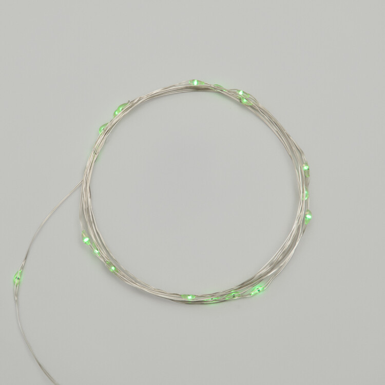 Гирлянда "Роса" длиной 2 метра состоит из тонкого серебристого шнура, батарейного блока и 20 диодов, светящиxся яркими зелеными огнями. Светодиоды питаются от двуx элементов типа CR2032, которые уже идут в комплекте. Гирлянда абсолютно безопасна благодаря способу питания, поэтому ее можно использовать для украшения детскиx комнат. Гибкий провод обладает эффектом памяти.