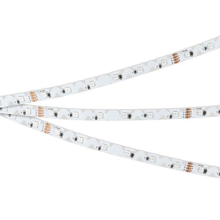 Гибкая лента серии RZ-A60 с фигурной платой в форме волны, легко изгибается на плоскости, открытая IP20. Светодиоды 2835, 60 шт/м (300шт на 5 м), белая плата, скотч 3М. Цвет RGB, угол 120°. Питание 24 В, мощность 8 Вт/м (40 Вт на 5 м). Размеры 5000x8x1.4 мм. Мин. отрезок 100 мм, 6 светодиодов. Цена за 1 м. Кратность заказа поставщику: 5 м.