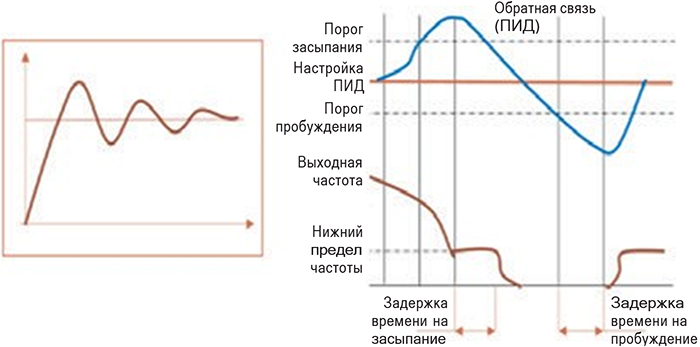 когда давление достигнет значения, установленного как порог для пробуждения, и пройдет время задержки на пробуждение, ПЧ включится автоматически.