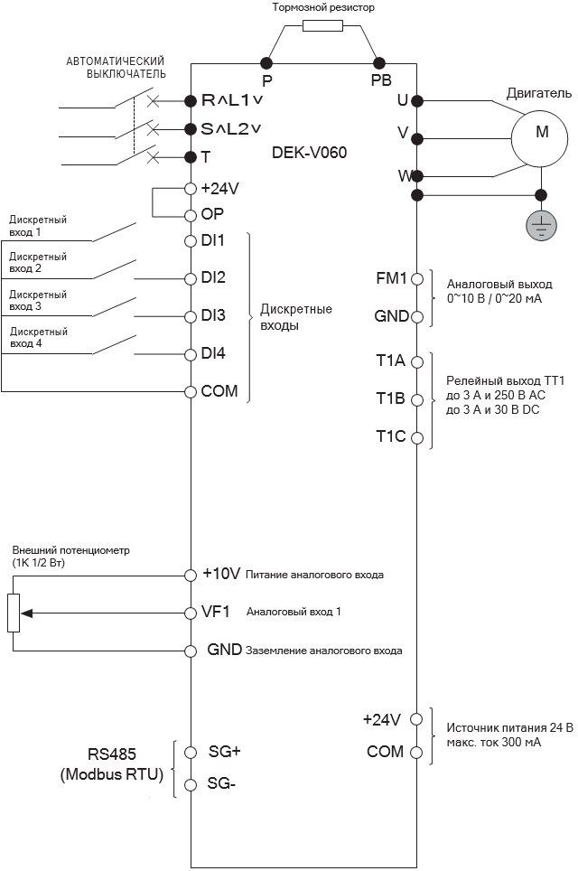 | Входы аналоговые | 1 аналоговый вход VF1 может служить в качестве входа напряжения (0 - 10 В) или тока (0/4 ~ 20 мA) |