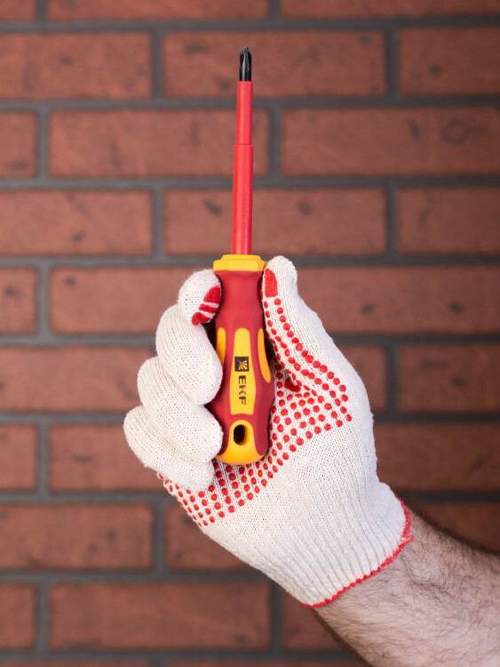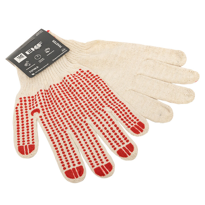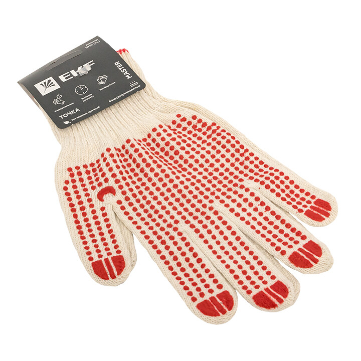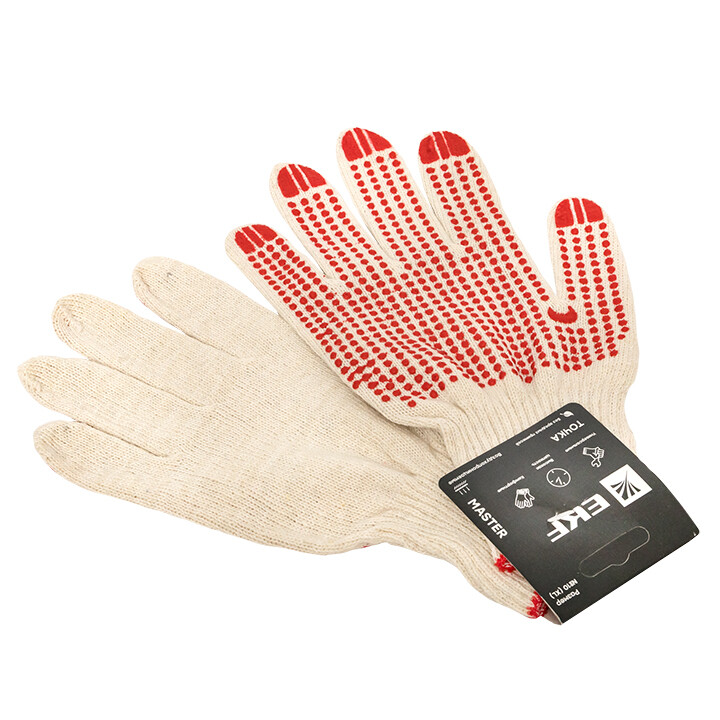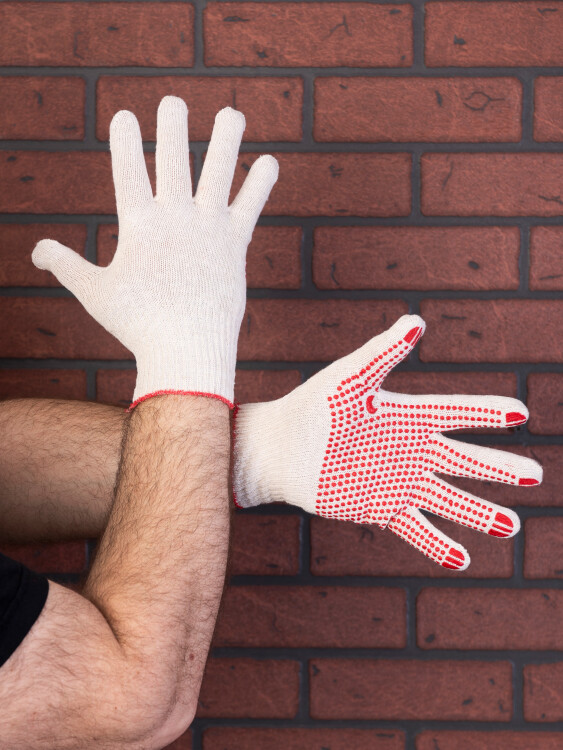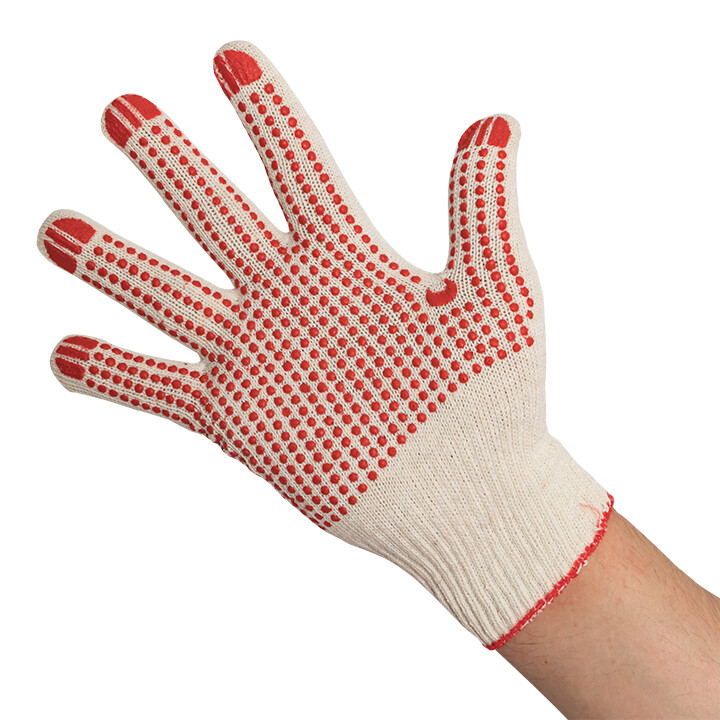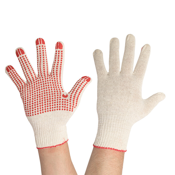 Трикотажные хлопчатобумажные перчатки из смесовой пряжи. Выполнены по технологии бесшовной вязки, что создает повышенный комфорт при работе. ПВХ-покрытие «Точка» обеспечивает высокую стойкость к истиранию и превосходно защищает ладонь