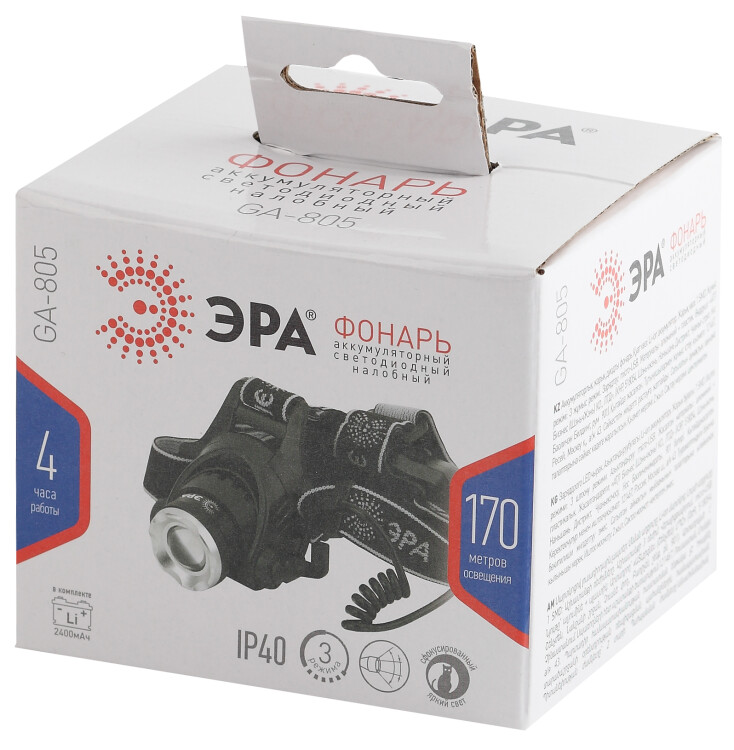 ЭРА GA-805 налобный аккумуляторный фонар ь с яркими экономичными светодиодами CREE мощностью 5 Вт. Фокус фонаря можно изменять, выбирая между дальним направленным лучом и ближним широким светом. В комплекте мягкий эластичный ремешок с брендированием и возможностью регулировки размера. Корпус фонаря изготовлен из ударопрочного пластика, устойчивого к механическим повреждениям, царапинам, сколам. Устройство прослужит долго и сохранит свой презентабельный вид. Фонарь выполнен в базовом черном цвете с матовым покрытием, линза обрамлена эффектным кольцом стального оттенка. ЭРА GA-805 компактен и удобен в использовании не требует батареек, подзаряжается от USB.