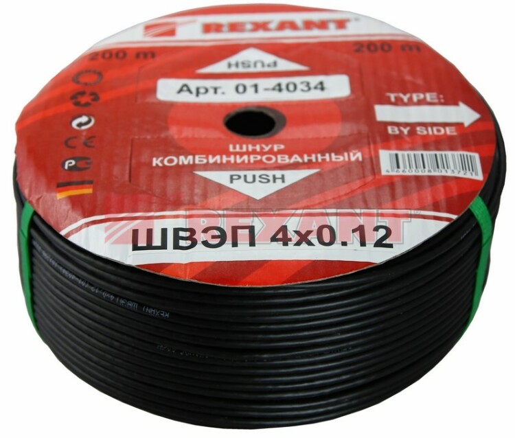Шнур комбинированный ШВЭП (ШСМ) 4x0.12мм?, 200м., черный Rexant 01-4034 REXANT,