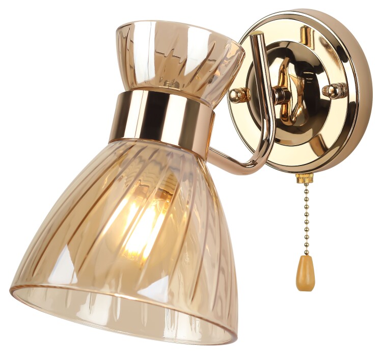 Золотой настенный светильник с тонированным плафоном — стильное и универсальное решение для современного интерьера. Бра оснащено удобным выключателем-цепочкой. Подходят лампы с цоколем E27, мощностью до 60 Вт (лампа в комплект не входит).