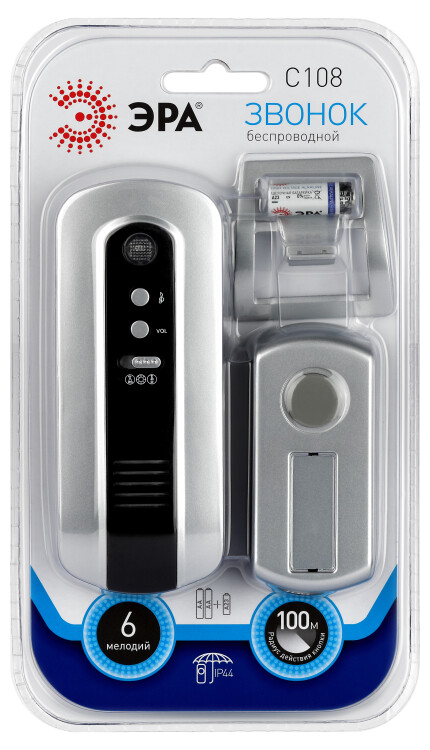Беспроводной электрический дверной звонок с возможностью подключения до 4 дополнительных звонков. Прост в установке и имеет особые функции - выбор любой из 6 встроенных мелодий, регулировка громкости, световой сигнал с возможностью изменения яркости. Чтобы начать пользоваться этим звонком, достаточно закрепить кнопку двусторонним скотчем на стене в подъезде. Динамик можно разместить в коридоре или взять с собой в комнату/на кухню – если не хотите разбудить кого-то из спящих в соседней комнате домочадцев. Удобно использовать беспроводные звонки ЭРА и на даче – устанавливать кнопку на дверной калитке, а механизм – в доме. И никаких проводов. Радиус действия – до 100 метров. Работает от батареек: 1 шт А23 для кнопки (входит в комплект), 2 шт АА пальчиковые для динамика (в комплект не входят). При среднем использовании (до 20 звонков в день) исправно проработает без замены элементов питания не менее года. Универсальный дизайн делает данный звонок идеальным для интерьера в любом стиле. Аккуратный продуманный внешний вид и приятная упаковка - отличный подарок на новоселье и другие праздники.