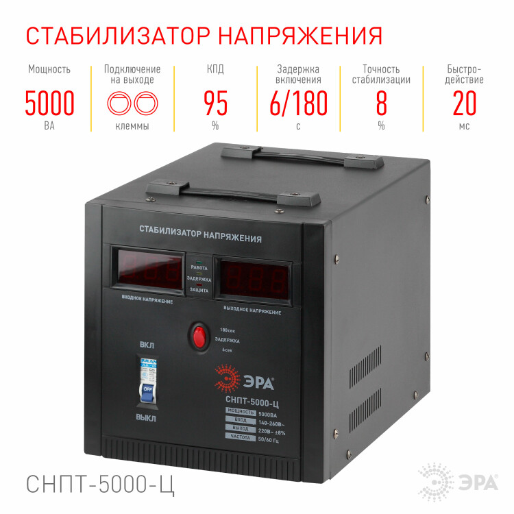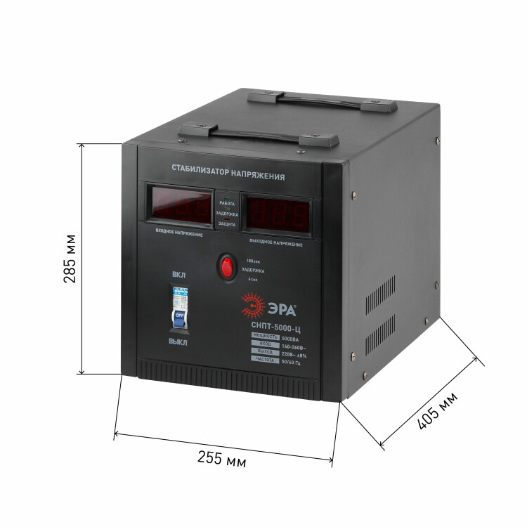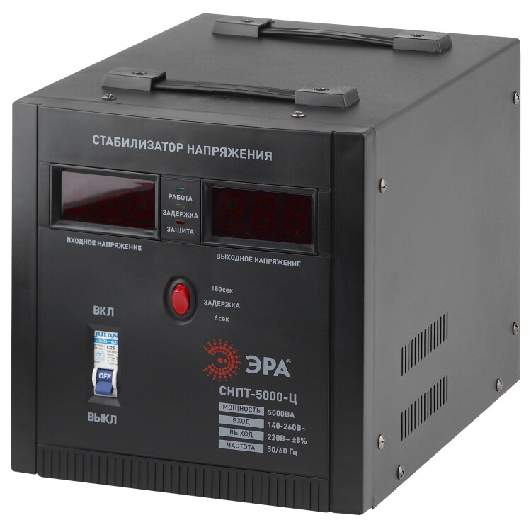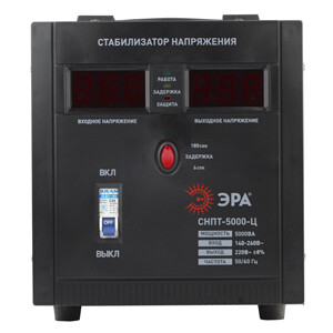 Стабилизатор напряжения переносной /напольный однофазный релейный цвет чёрный модели СНПТ-5000-Ц. Номинальные характеристики (полная мощность / диапазон входного напряжения): 5000ВА 140-260В . Предназначен для поддержания стабильного однофазного напряжения питания бытовых приборов при отклонениях значений сетевого напряжения. Выбирая стабилизатор, нужно знать, какое электрооборудование будет к нему подключено: один прибор, группу приборов либо вся домашняя (офисная) техника. Затем необходимо рассчитать суммарную мощность защищаемых электропотребителей. Основное условие выбора мощности стабилизатора напряжения - суммарная мощность подключаемой к нему нагрузки не должна превышать полной мощности самого стабилизатора (в противном случае автоматика стабилизатора будет их просто отключать). Точные значения мощности можно узнать из паспортных данных Вашего конкретного потребителя. Стабилизатор подбирается с запасом в 25-30% к его полной мощности.