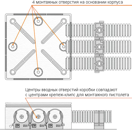 - Монтажные отверстия соосны с клипсами для монтажного пистолета "Промрукав", что обеспечивает идеально ровный и эстетичный ввод труб в корпус коробки.