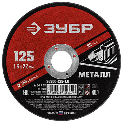Круг отрезной абразивный по металлу 125 х 1,6 х 22 мм "Зубр" 36300-125-1.6 "Мастер"