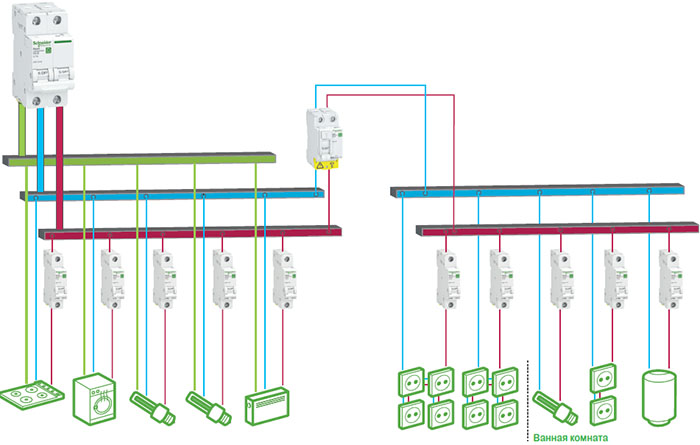 - В соответствии с пунктом 415.1 ГОСТ Р 50571.3-2009 в системах переменного тока должна быть предусмотрена дополнительная защита посредством выключателя дифференциального тока (ВДТ) всех цепей штепсельных розеток общего пользования на номинальный ток до 20 А и всех цепей в ванных и душевых комнатах.