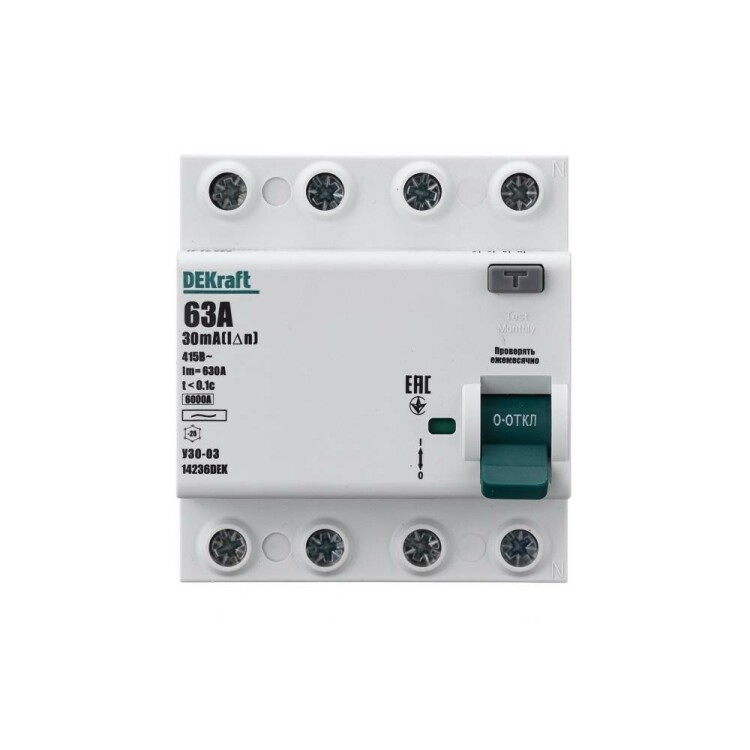 Выключатель дифференциального тока серии УЗО-03 Dekraft; 4P; номинальный ток 63 А; ном.дифф. ток 30 мА; электромеханический; тип дифференциального расцепителя - AC; на DIN-рейку. ВДТ устанавливаются в сетях напряжением до 400 В пер.тока. ВДТ применяются для защиты электроустановок от риска возникновения пожаров вследствие утечек тока. Конструкция устройств позволяет эксплуатировать их даже при низкой температуре.