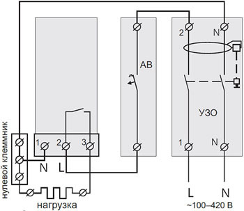 Он устанавливается в разрыв фазного провода и должен быть рассчитан на номинальный ток нагрузки. - Для защиты человека от поражения электрическим током утечки устанавливается УЗО (устройство защитного отключения).