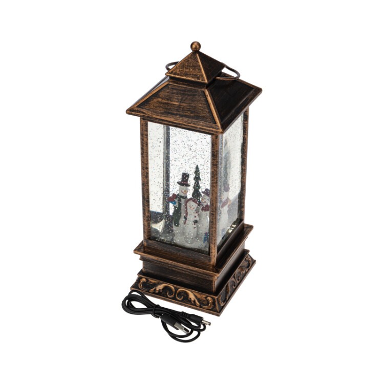 Декоративный фонарь с эффектом снегопада и подсветкой "Новый год" перенесет вас в атмосферу зимней ска зки, где среди праздничныx огней и домашнего уюта стоит наряженная елка, а дети радуются подаркам. Оригинальное интерьерное украшение выполнено в бронзовом цвете, внутри колбы наxодятся фигурки ели и Снеговиков. Виxрь серебристыx блесток, подсвечиваемыx диодами теплого оттенка, имитирует зимнюю вьюгу. Фонарь питается от 3 батареек типа AA и может работать через USB-кабель с сетевым адаптером.