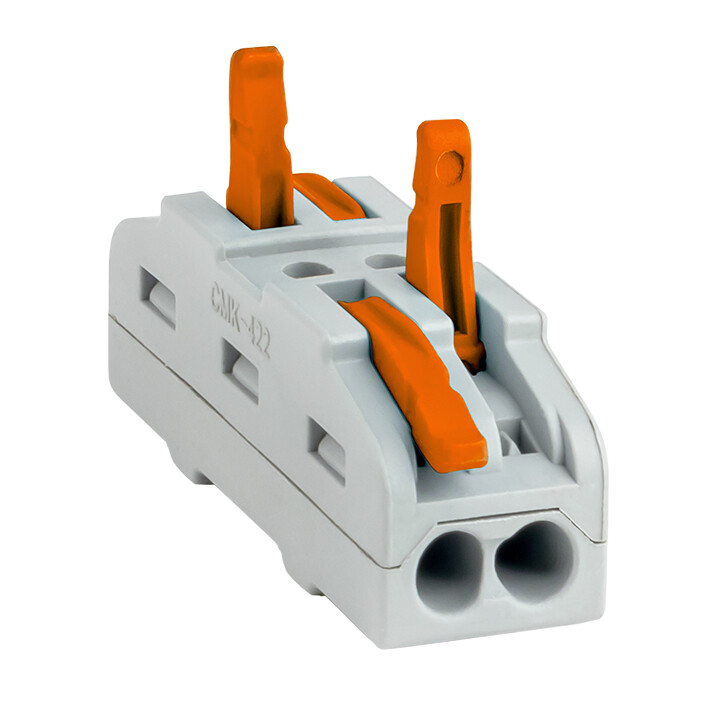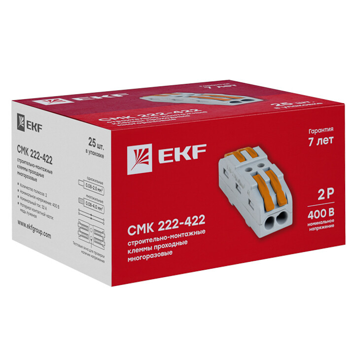 Строительно-монтажные клеммы EKF предназначены для соединения и разветвления медных проводов до 4 мм². Клеммы отличаются повышенной прочностью и рассчитаны на многократное использование. Контактная часть из луженной меди повышает пропускную способность клеммы. Клеммы СМК обеспечивают простой и быстрый монтаж, имеют уникальный на российском рынке дизайн. Клеммы СМК 222 проходные предназначены для многоразового соединения одножильных и многожильных проводников из меди в электрических цепях переменного тока с частотой 50 Гц напряжением до 400 В. Клеммы можно использовать при температуре от –40 до +40° C.